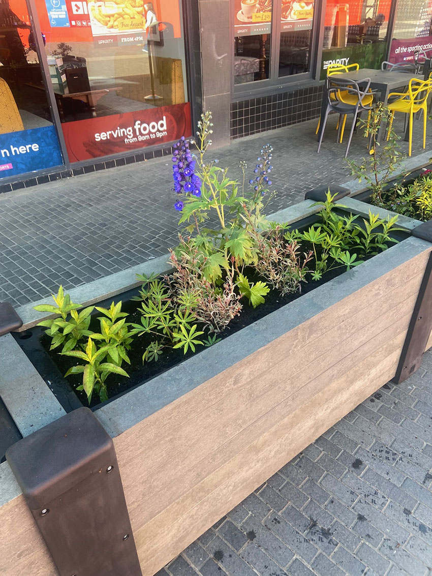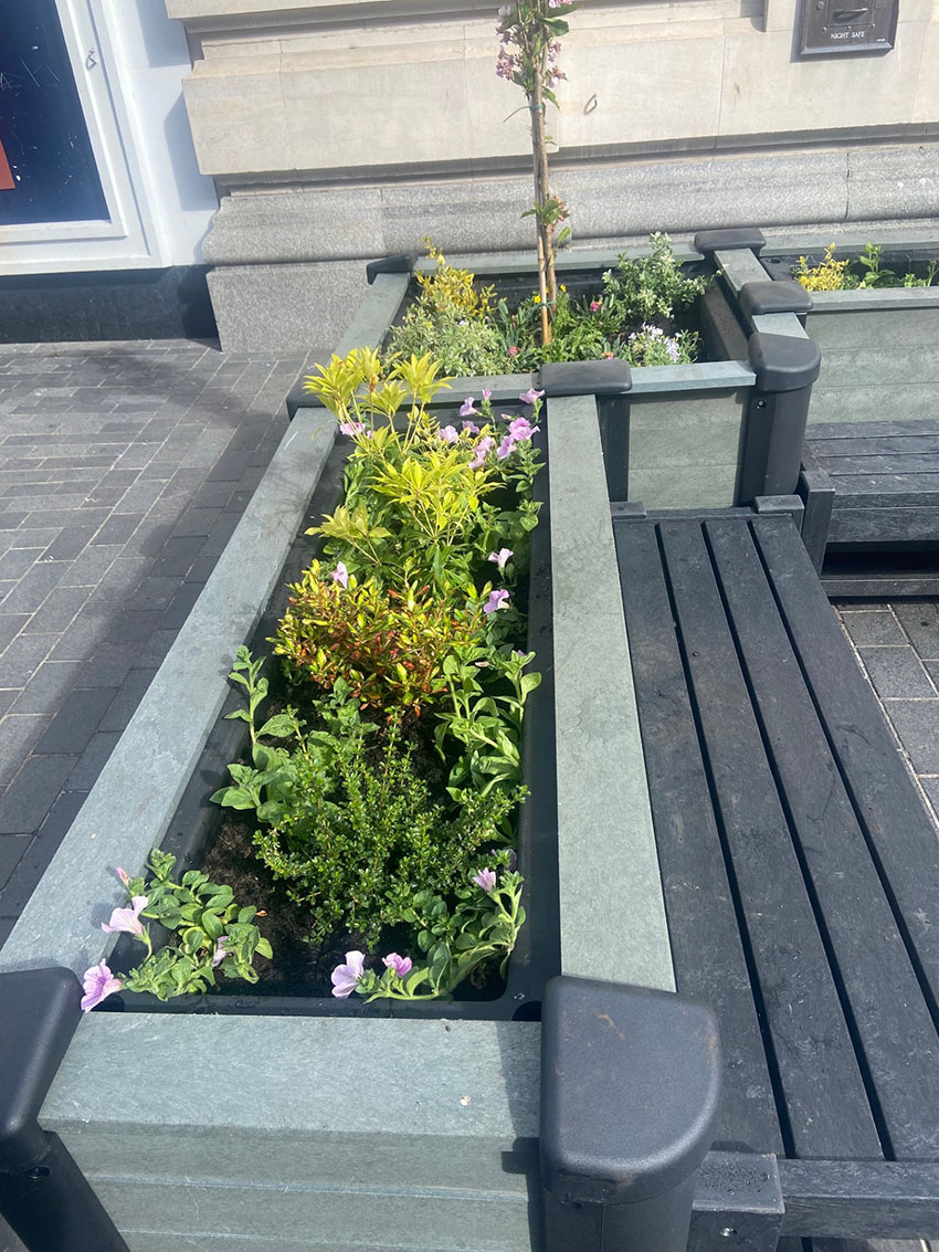 The distinctive green bowl planters along Victoria Street are a vibrant and eye-catching feature, designed to bring natural beauty into the heart of the town. Positioned at ground level, these planters are carefully planted to create a dramatic display when viewed from all angles, drawing attention from passers-by and enhancing the streetscape.